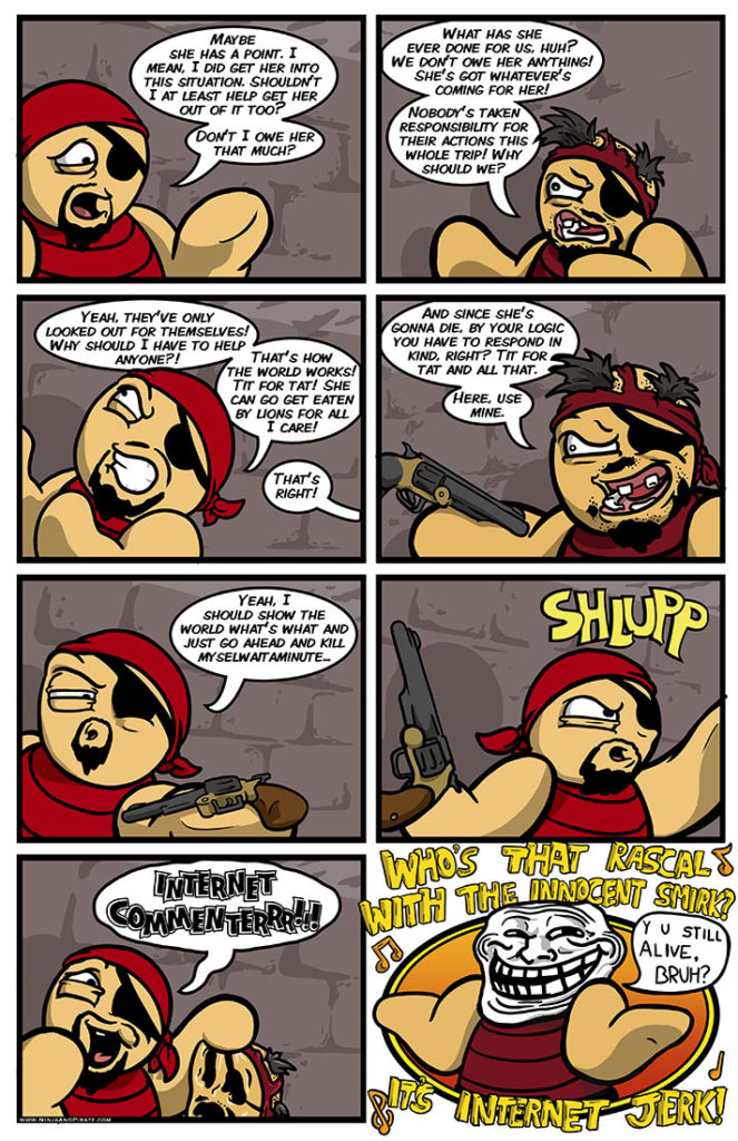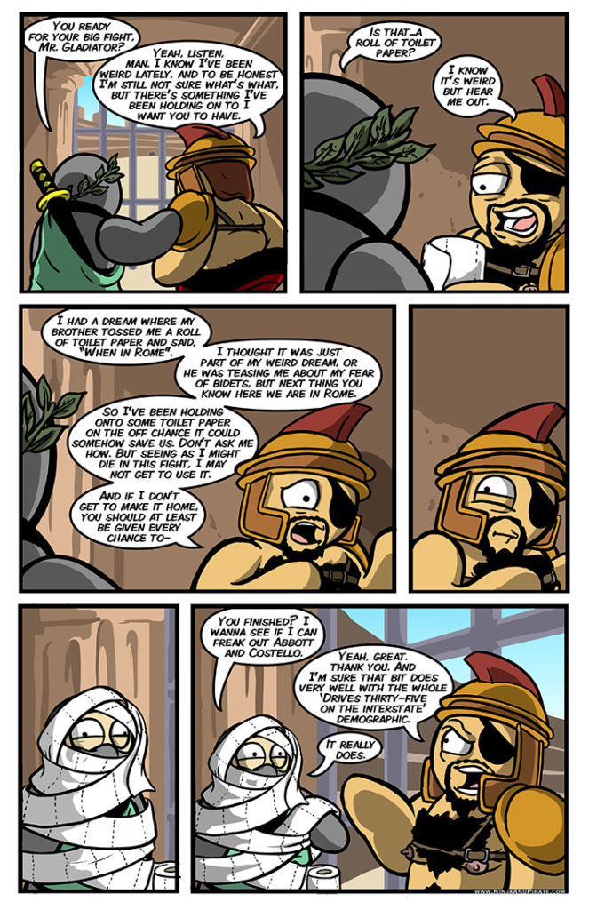 That’s a Ralph Wiggum face in the last panel for sure. Also, I’m pretty sure ‘montage’ also translates to ‘sweet 1980’s synth rock time’. Always fade to black in a montage. If you fade out it seems like more time[…]↓ Read the rest of this entry…