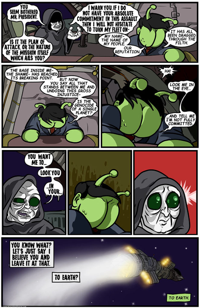 I’m exhausted everybody. I’ve been sick. The kid’s been sick. I’m done. So no clever blog post today. And I know I’ve been trying to make my background art fit the goofy cartoon style of the comic more, but it[…]↓ Read the rest of this entry…